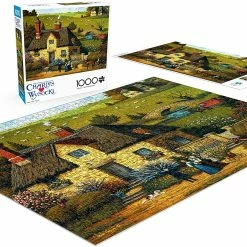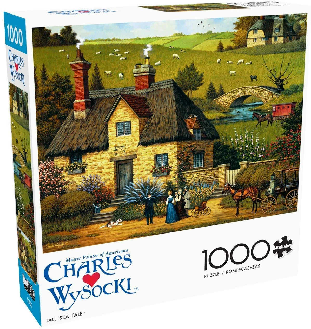 This 1,000-piece jigsaw puzzle, Tall Sea Tale, is by artist Charles Wysocki. A horse and buggy await outside of a stone cottage set on a property with sheep roaming about.