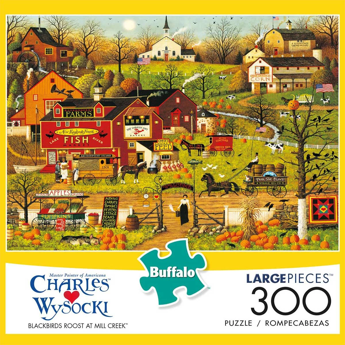 Here at Mill Creek, you will encounter the traditional life and town within the New England area. Apples sold at the side of the street, chicken feed is available and horse and buggies trot through the dirt roads. Β This 300-large piece jigsaw puzzle, Blackbirds Roost at Mill Creek, is by artist Charles Wysocki.Β