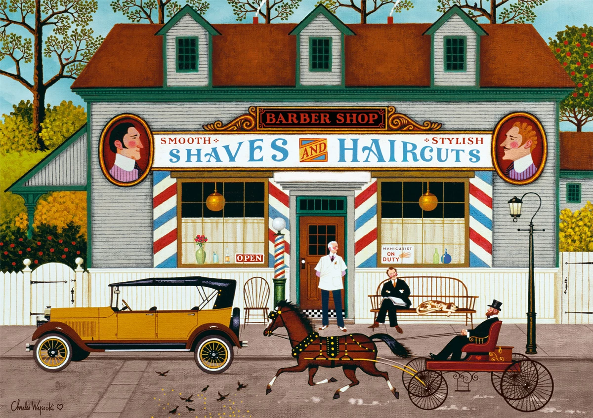 Itβs a slow day at the barber shop in this 300-large piece jigsaw puzzle, Slow Day, by Buffalo Games from the work of artist Charles Wysocki.
