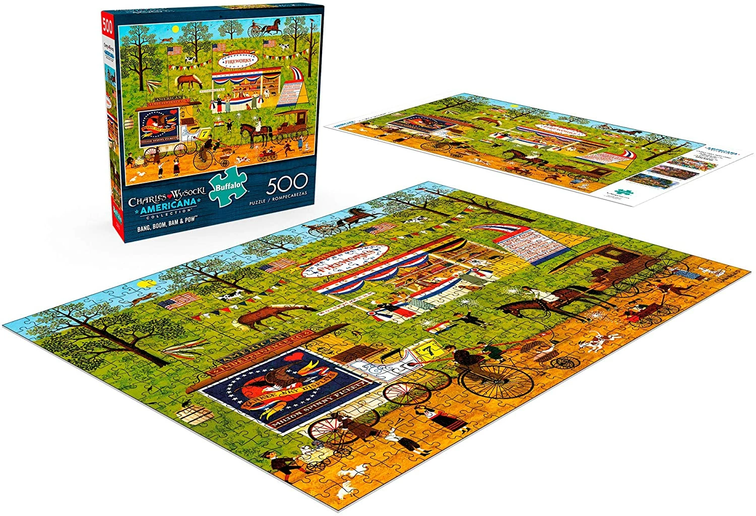 In this 500-piece puzzle, Bang, Boom, Bam & Pow, witness the American Independence Fireworks Company and all the excited town goers ready to enjoy all the fireworks up for grabs. Based on the artwork of Charles Wysocki, this puzzle is a part of the Americana Collection by Buffalo Games.