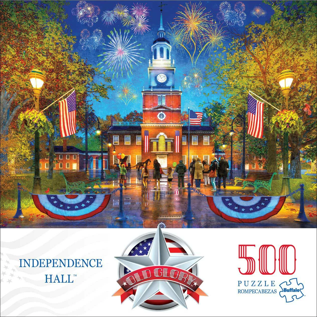 A colorful display of fireworks are launched into the night sky, over Independence Hall, as a few spectators are caught enjoying this marvelous sight. Enjoy this patriotic puzzle as you place each piece. This 500-piece puzzle, Independence Hall, is part of the Old Glory collection by Buffalo Games.Β