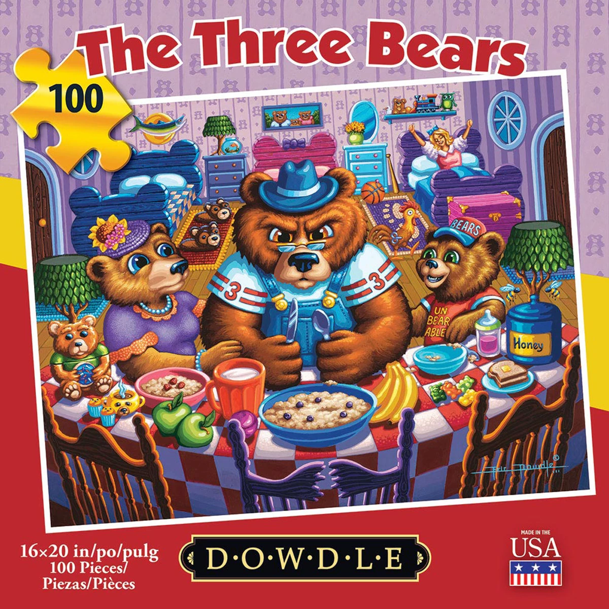 In the 100 piece jigsaw puzzle, The Three Bears by Dowdle Folk Art, an illustration of the noteworthy three bears eating porrage at the dinner table is depicted. The artist, Eric Dowdle, made this illustration colorful, detailed, and interesting. This puzzle has dimensions of 20″ x 16″ which makes this a fun and challenging activity to do with the entire family—especially if you enjoy animated illustrations.