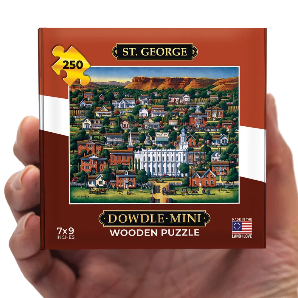 This magnificent Southern Utah city, settled in 1861, is surrounded by red cliffs and is close to several state and national parks. With hot summers and mild winters, St. George is a popular retirement hot spot and one of the fastest growing communities in Utah. The LDS Temple takes center stage in this painting, surrounded by several historical pioneer homes.