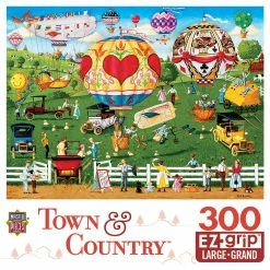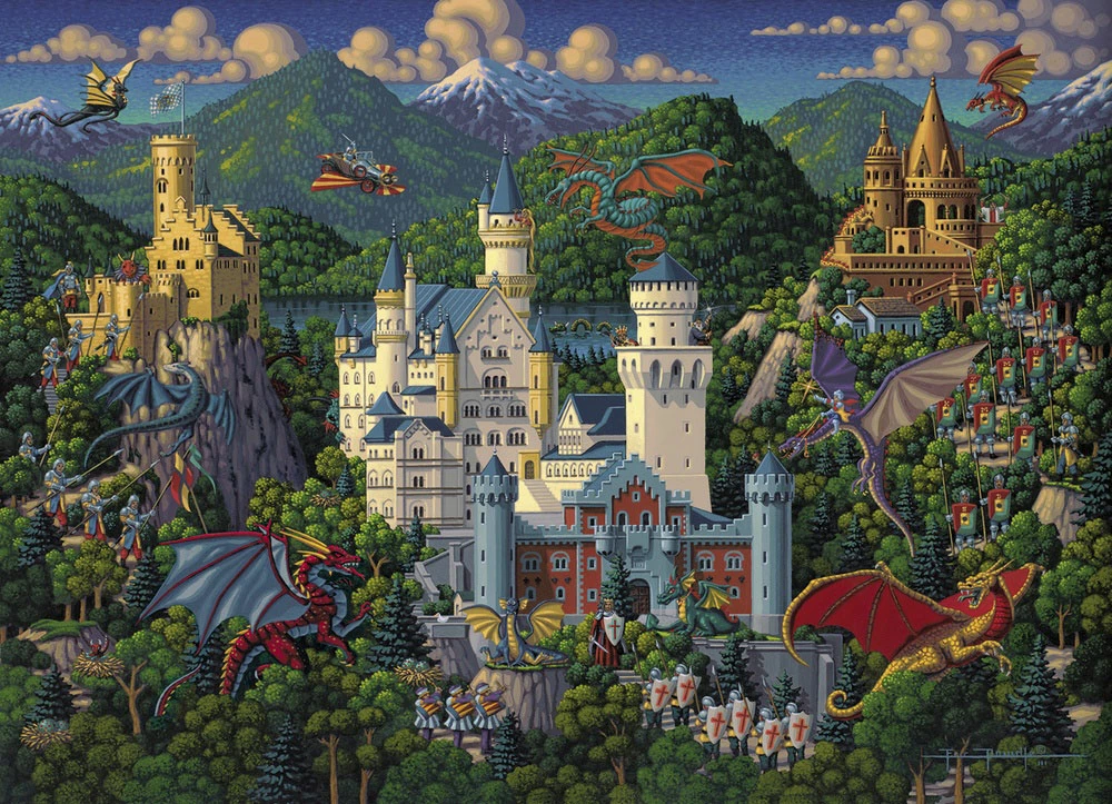 In the 300 piece jigsaw puzzle, Imaginary Dragons by Dowdle Folk Art, an illustration of a big white castle with dragons flying around it is depicted. The artist, Eric Dowdle, made this illustration colorful, detailed, and somewhat magical.ย