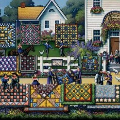 Β Amish quilts are highly prized and one pays a pretty penny for one nowadays and there’s no shortage of them in this puzzle. Full of color and detail, Dowdle has amazed again. With sharp triangular patterns and bold colors each quilt is a focal point and asset to the paining. Big homes and an old forest present a colorful backdrop with lush greens and bright yellows, whites and oranges,Β