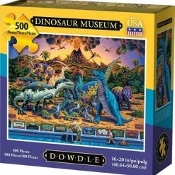 In the 500 piece jigsaw puzzle, Dinosaur Museum by Dowdle Folk Art, an illustration of a dinosaur exhibit in a dinosaur museum is depicted. The artist, Eric Dowdle, made this illustration colorful, detailed, and historical. This 10+ puzzle has dimensions of 16″ x 20″ which makes this a fun and challenging activity to do with the entire familyβespecially if you’re a dinosaur lover.