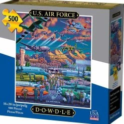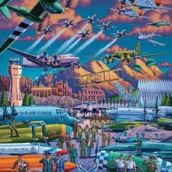 In the 500 pieceΒ jigsaw puzzle, U.S. Air Force by Dowdle Folk Art, an illustration of all kinds of planes belonging to the U.S. Air Force is depicted. The artist, Eric Dowdle, made this illustration colorful, detailed, and interesting. This 10+ Β puzzle has dimensions of 20″ x 16″ which makes this a fun and challenging activity to do with the entire familyβespecially if you enjoy planes or the U.S. Air Force.Β