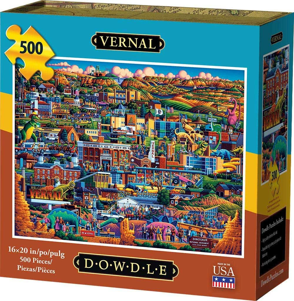In the 500 piece jigsaw puzzle, Vernal by Dowdle Folk Art, an illustration of the town of Vernal is depicted. The artist, Eric Dowdle, made this illustration colorful and detailed, as well as interesting. This 10+ puzzle has dimensions of 20″ x 16″ which makes this a fun and challenging activity to do with the entire familyβespecially if you enjoy town illustrations.Β