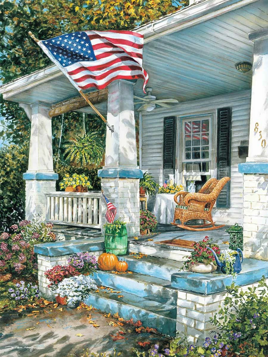 This beautiful puzzles depicts the pride of America, the American Flag, standing guard on a beautiful fall porch.