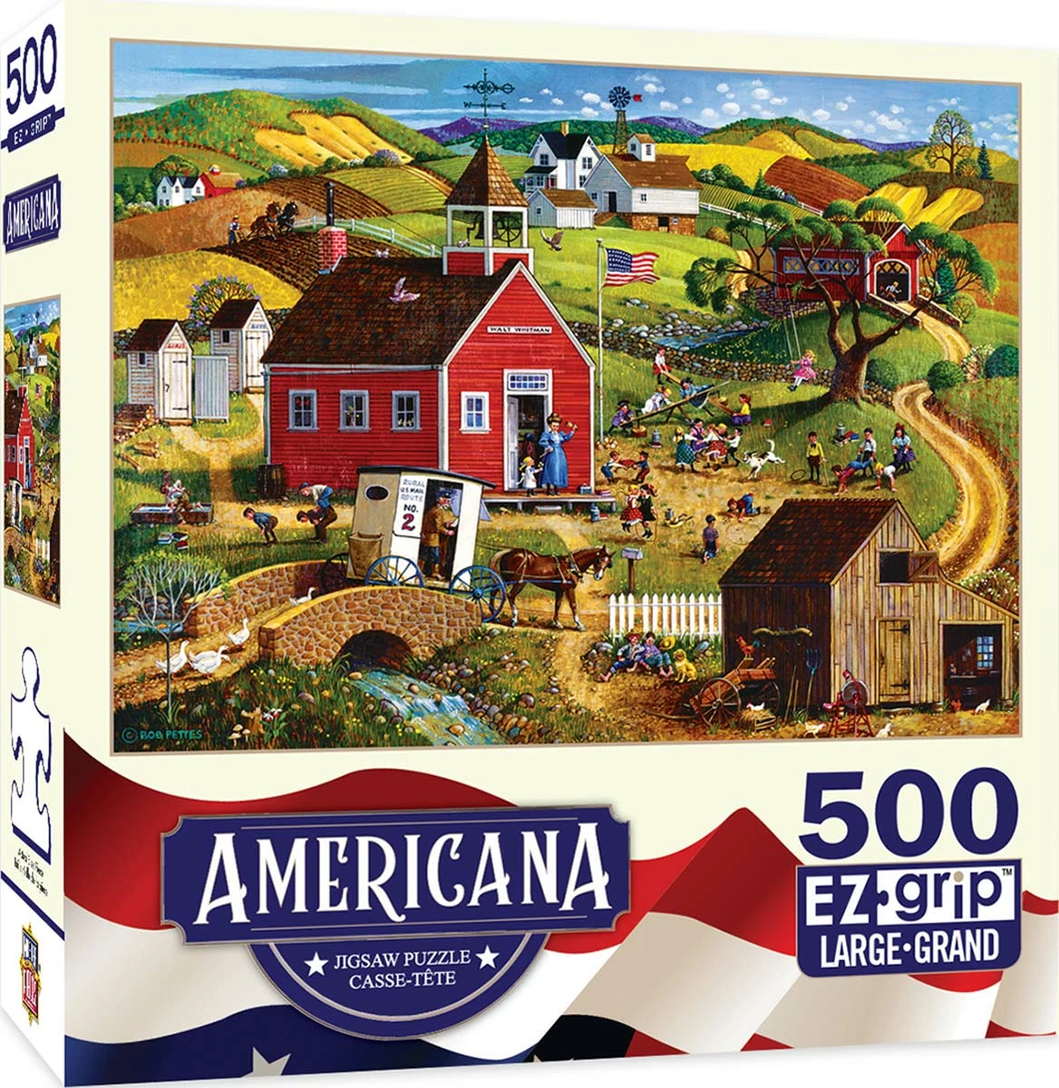 School Days displays detailed tones of warm colors with the use of yellows that help bring depth into the MasterPieces puzzle. The 500 piece puzzle features a small rural town as kids of the community go to school. This 10+ puzzle with a total size of 26.75″ x 19.25″ is a perfect challenge for any skill level and folk art fanatics.