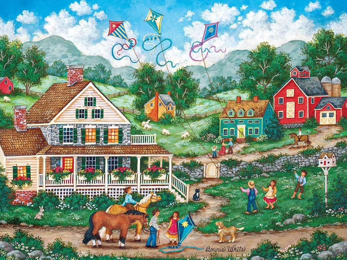 Crosswinds is a MasterPieces 550 piece puzzle featuring several children of a small rural town enjoying the weather by flying kites. The Folk Art by Bonnie White displays gorgeous colors that helps bring light into any area upon completion.