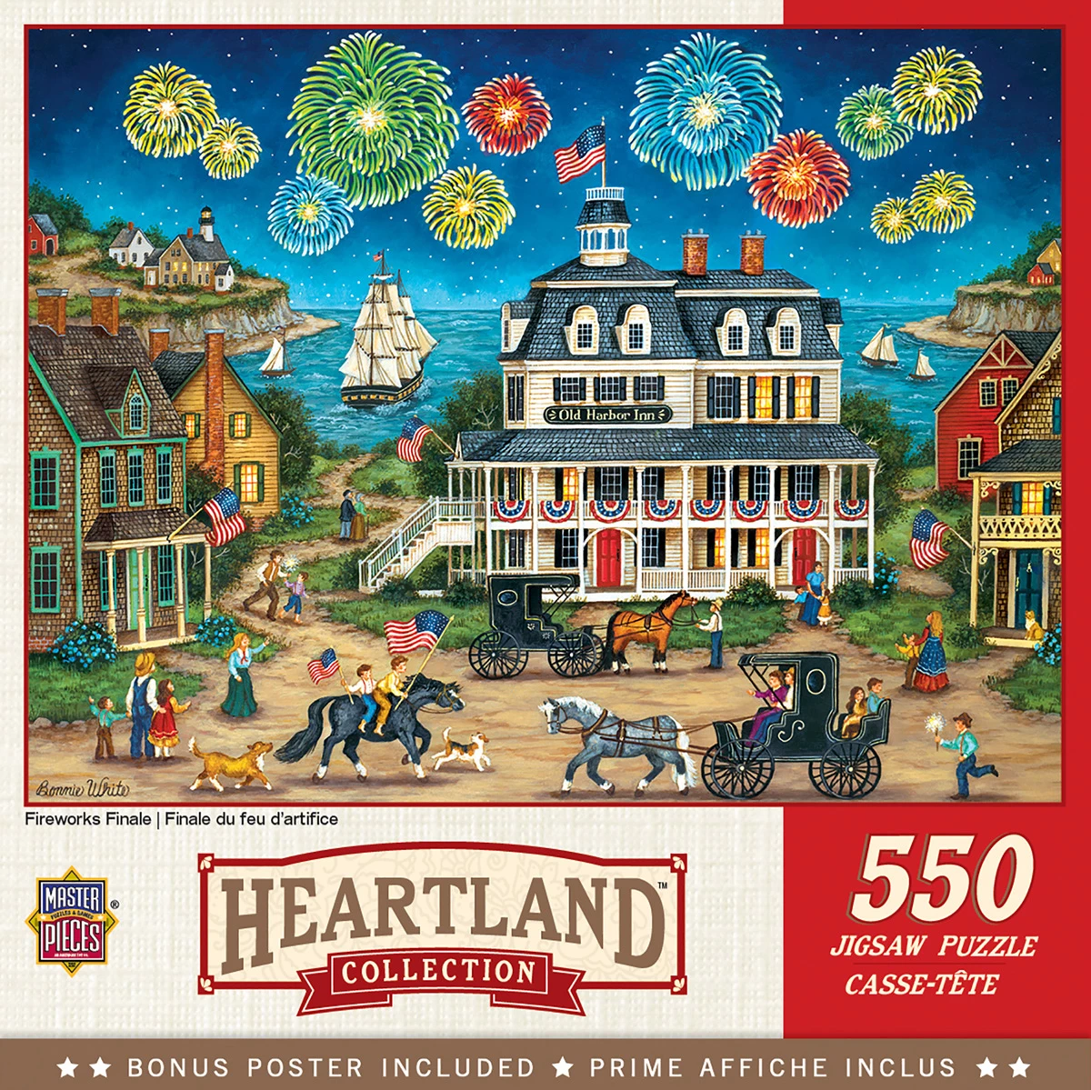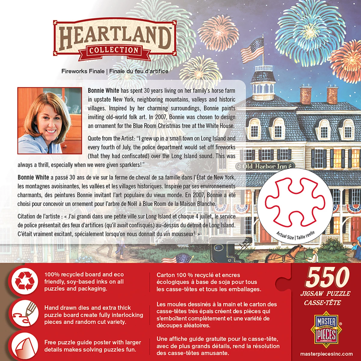 This MasterPieces 24″ x 18″ 550PC Heartland puzzle was created by the talented Bonnie White. Inspired by the charming scenery on her family’s farm in upstate New York, as well as neighboring mountains, valleys, and historic villages, Bonnie White creates beautiful landscapes of old-world folk art and culture. This puzzle is no exception, with a magnificent display of fireworks lighting up the night sky of a historic, seaside town. For more Bonnie White folk art, visit her website at www.bonniewhitefolkart.com. To reduce its impact on our environment, the chipboard used in this puzzle is made of recycled material.