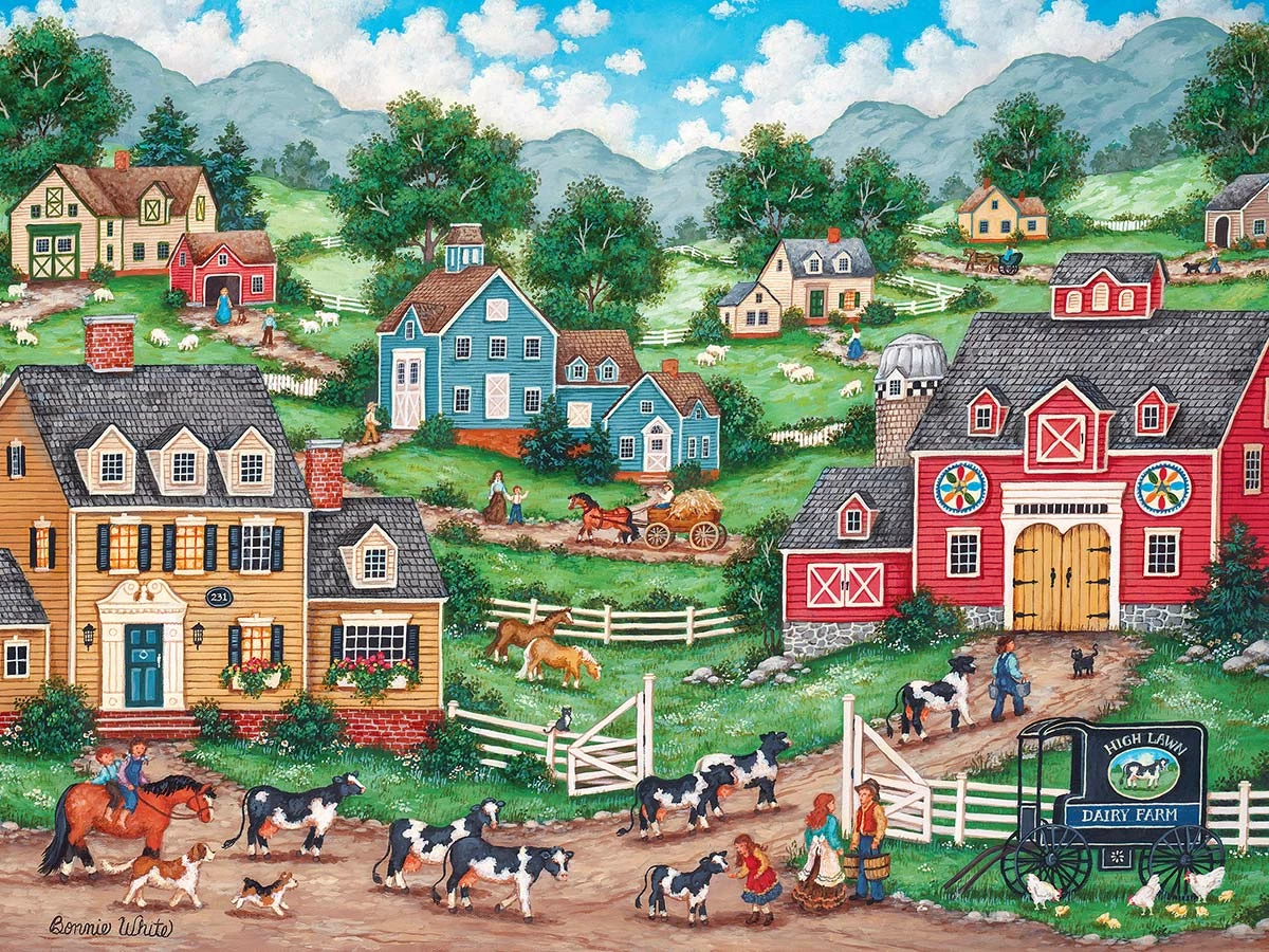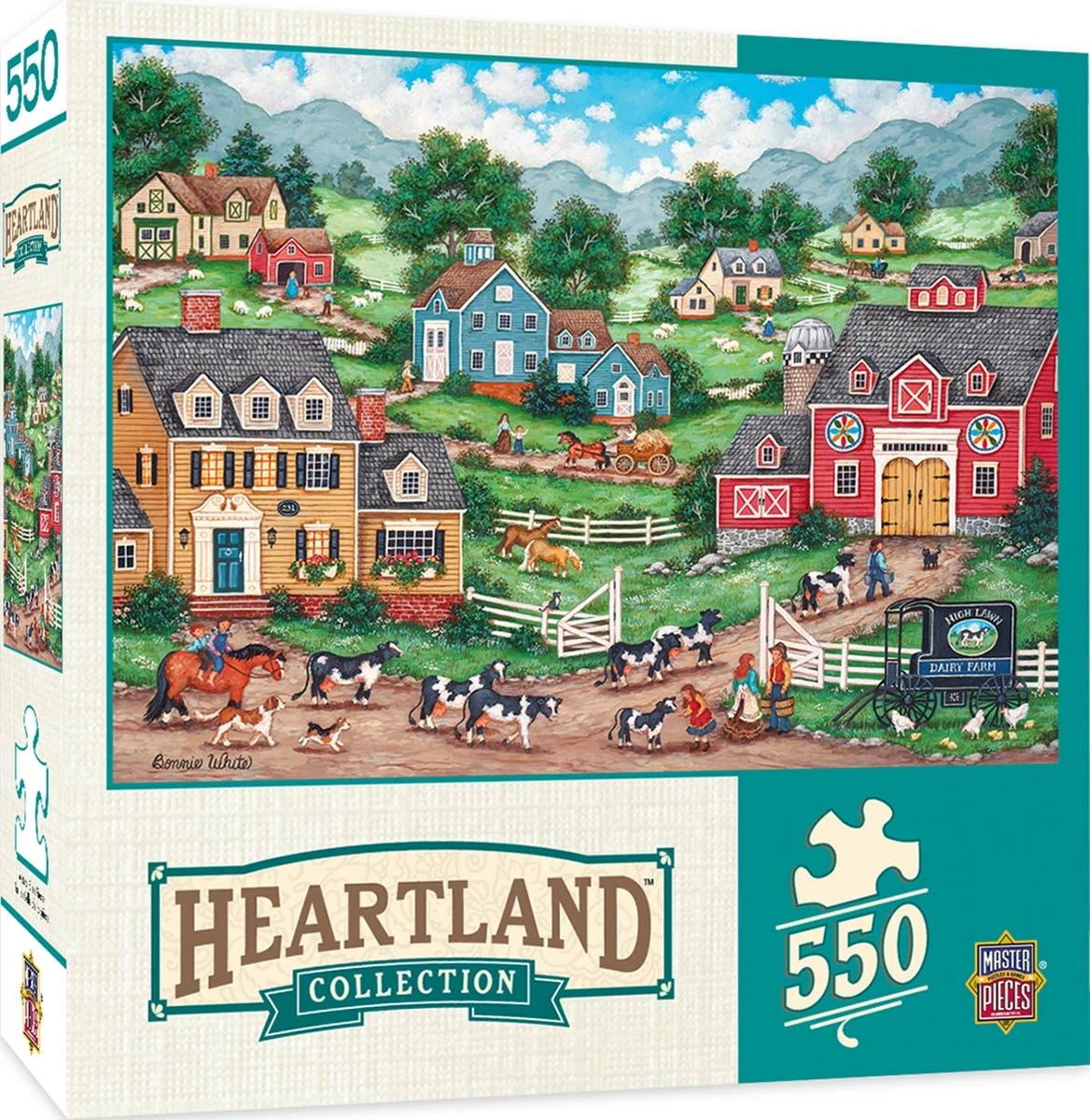 The Curious Calf is a 550 piece jigsaw puzzle that features a rural town as cows walk to the local dairy farm with other livestock and people surrounding the red barn. This MasterPieces puzzle displays vivid shades of bright colors that creates the image to come to life as the completed dimensions are 24″ x 18″ making it the perfect illustration for any puzzle level.