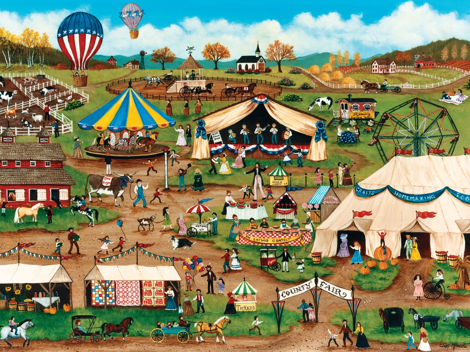 This MasterPieces 750pc Homegrown Puzzle of Country Fair features a folk art scene of a day at the fair with live music, a petting zoo, and tons of activities all around. This folk art collection features the talented work of Art Poulin. This puzzle is made of linen material which makes it easier to grip and see with no-glare. This linen puzzle is the perfect gift for any puzzle lover! To reduce its impact on our environment, the chipboard used in this puzzle is made of recycled material.