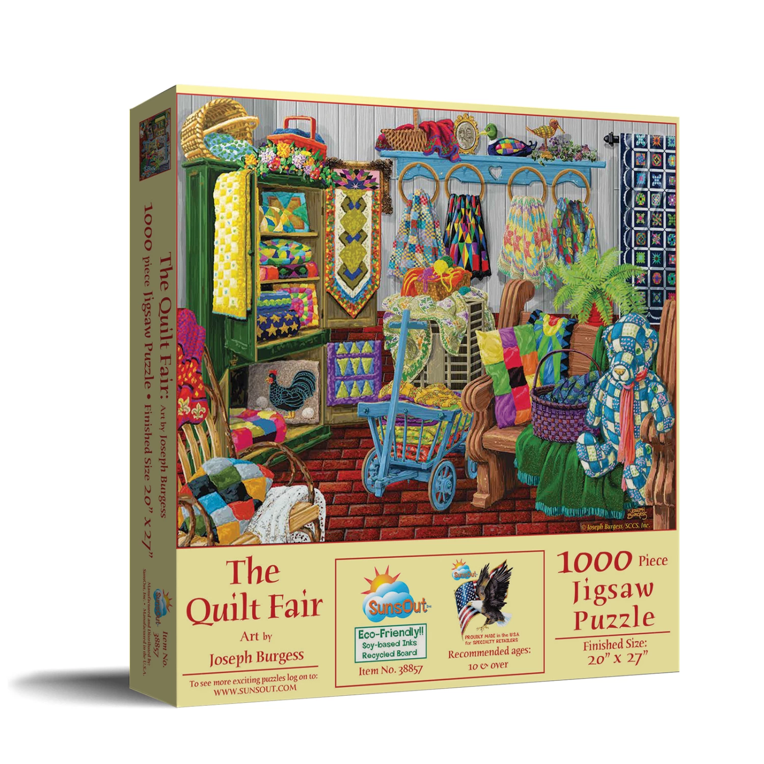 A quiet farm on the hillside is the main focus of βMorning Day Quiltβ by SunsOut. This 1000 piece puzzle features the artwork of Joseph Burgess. The bright, patterned quilts make for an interesting puzzle, and the scenery will keep you busy as you piece together this gorgeous puzzle. The completed puzzle will measure 20β x 27β.Β